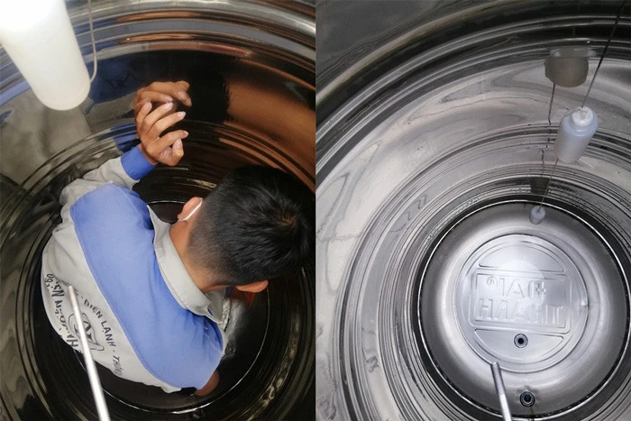 Kỹ thuật viên kiểm tra cấu trúc bể, khóa van cấp và xả toàn bộ nước cũ trong bể.