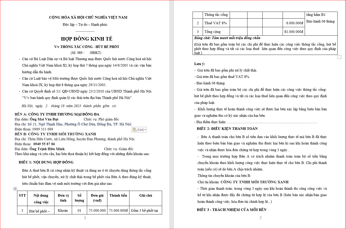 Công ty Môi Trường Xanh Hà Nội cam kết báo giá rõ ràng – không phát sinh chi phí.