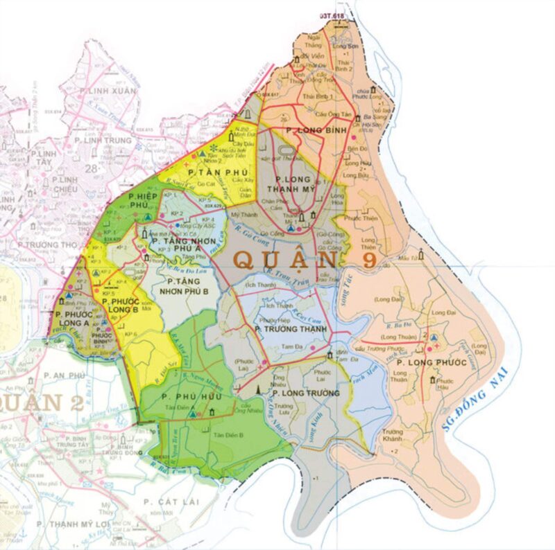 Các phường: Long Bình, Long Phước, Phú Hữu, Long Trường, Hiệp Phú, Tăng Nhơn Phú A – B, Phước Long A – B, Long Thạnh Mỹ, Trường Thạnh.