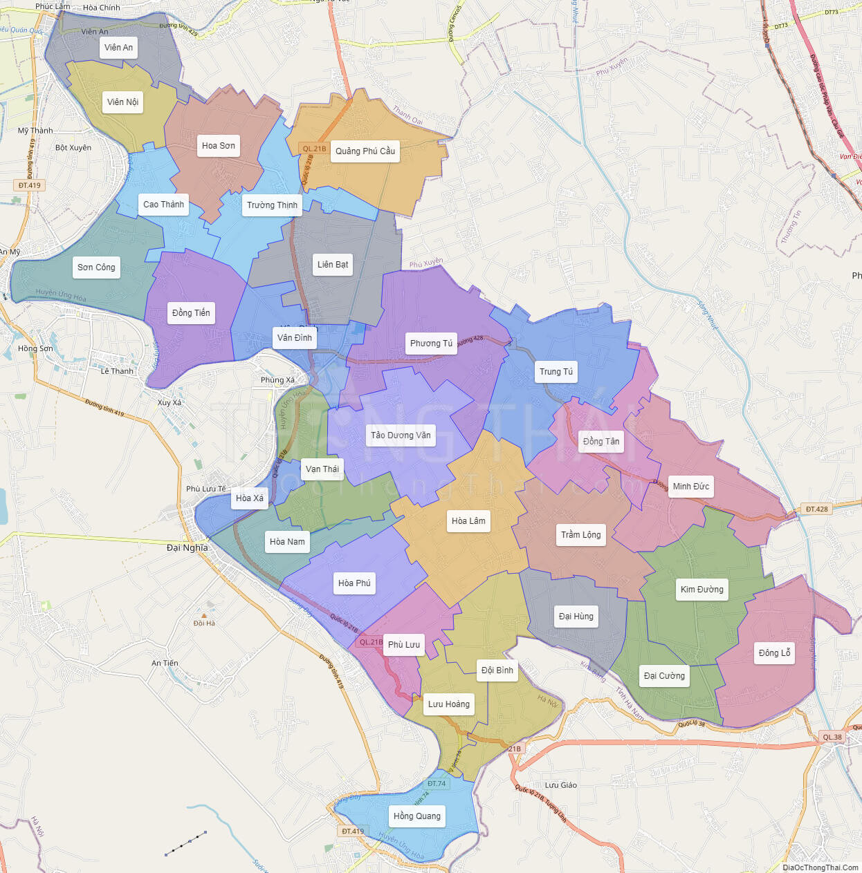 • Các xã: Liên Bạt, Viên Nội, Viên An, Hòa Nam, Hòa Lâm, Hòa Phú, Hòa Xá, Đại Cường, Trường Thịnh, Tảo Dương Văn, Đồng Tiến, Minh Đức, Quảng Phú Cầu, Phù Lưu, Đội Bình, Kim Đường, Sơn Công, Hòa Thịnh…