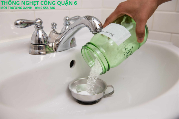 Pha baking soda + giấm trắng, đổ vào cống, chờ 15 phút rồi xả nước nóng.