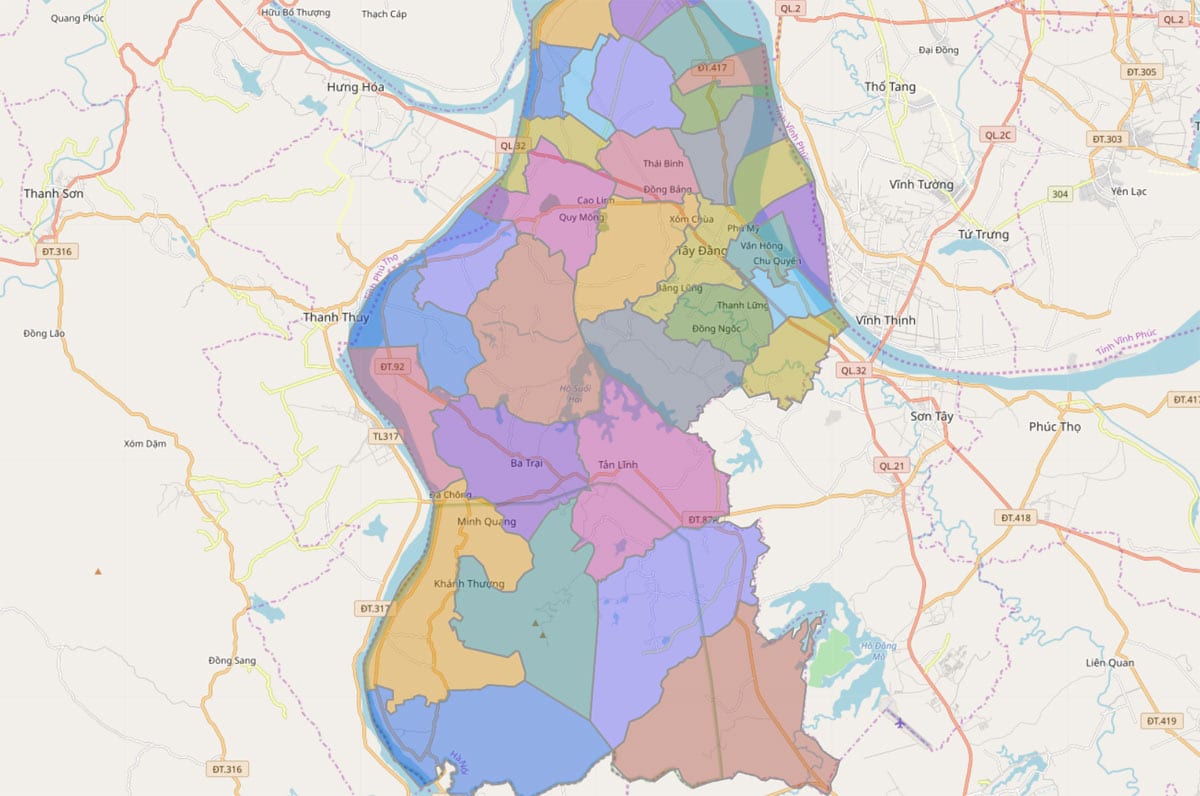 Các thị trấn, xã trung tâm: Tây Đằng, Tản Lĩnh, Chu Minh, Phú Châu, Sơn Đà, Cẩm Lĩnh, Minh Quang, Ba Trại…